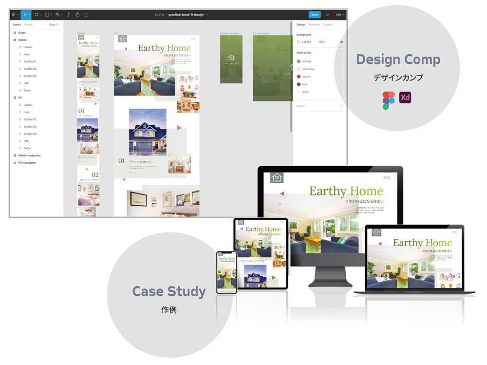 本書のプロジェクトではOverlappingデザイン(要素を重ねるデザイン)が施されたハウスメーカーのWebサイトを作成します。